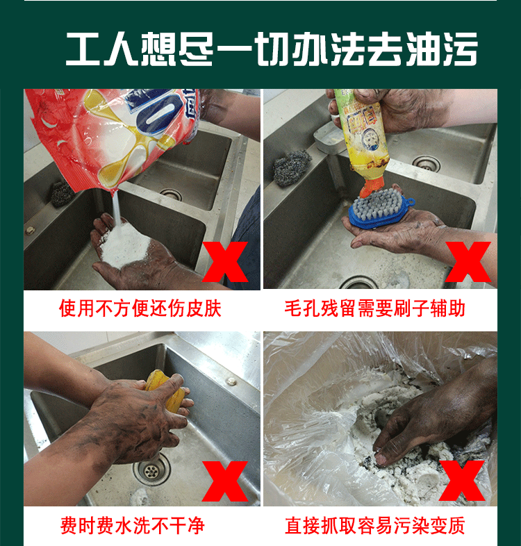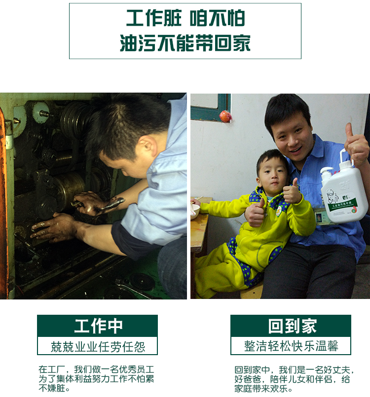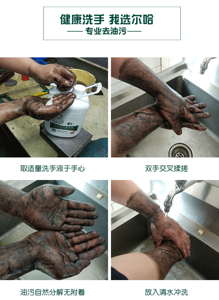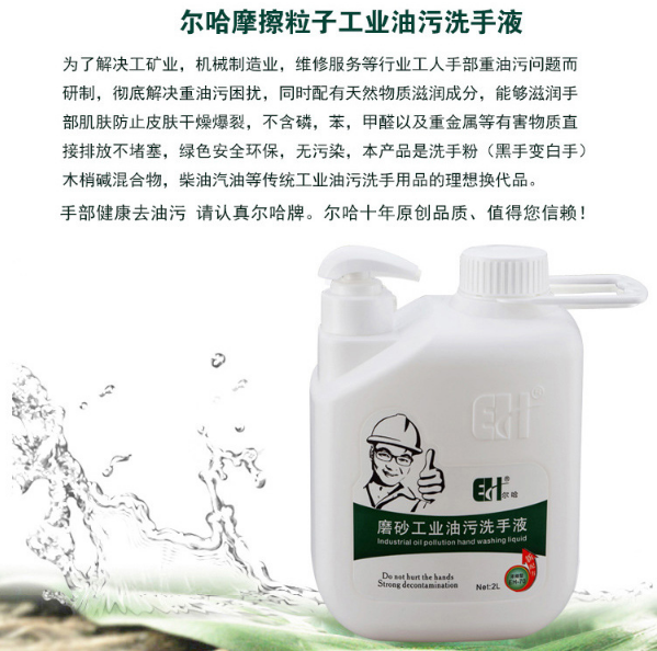 不是所有洗手产品都能做到健康去油污、手部健康去油污?请认准尔哈! 安全、环保、高品质!我们一直在坚持! 尔哈牌十年高端品质、只为此刻您的信赖!本产品适用于 汽修、模具、机械、五金、煤矿、油田、工厂所有制造业、的工人手部各种重油污垢清洗。尔哈高端品质、不仅不伤手哟!