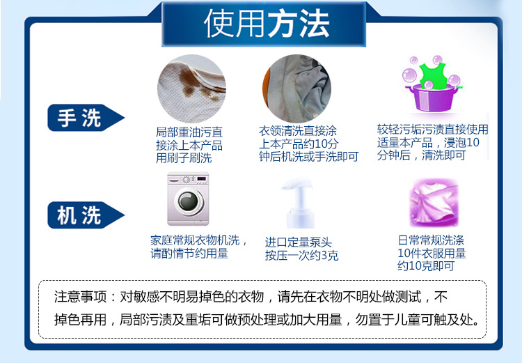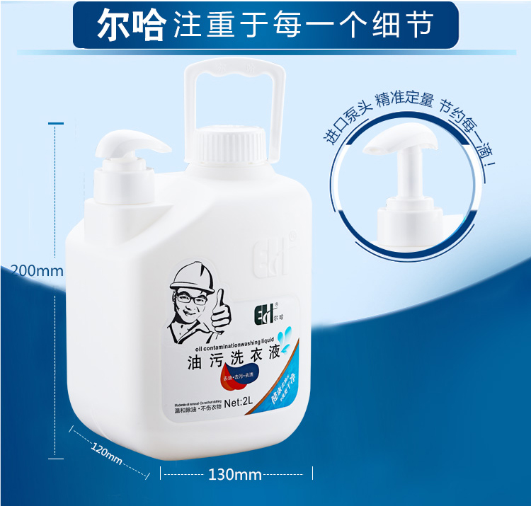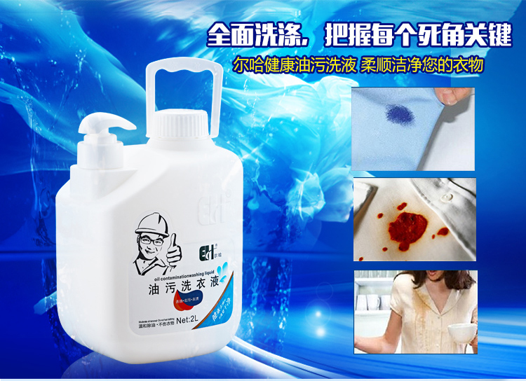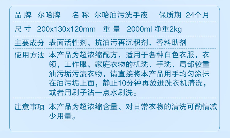 尔哈油污洗衣液: 适用于各种衣物重油污垢、污渍 家庭日常衣物 适用于手洗机洗不伤手 安全、环保、高品质,衣物健康去油污 请认准尔哈牌。健康去油污, 手洗更干净!
