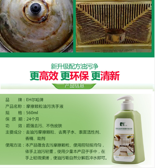 本产品主要针对厨房厨师手部油污、污渍,去腥味、沐浴清洗腋下异味、油烟机、微波炉、烤箱、灶台、瓷砖、锅底、卫生间、洗手台、衣服重污垢局部清洗等等各种油污,温和不伤手,家庭清洁好帮手!整箱购24瓶,还有更多惊喜好礼相送!
